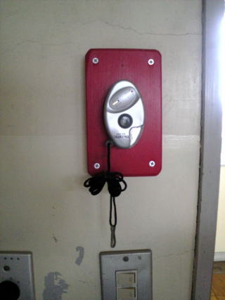 赤い板に防犯ブザーを貼付けて
